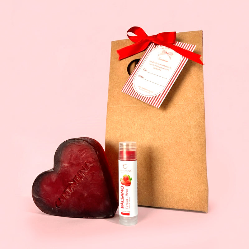 Este set cuidadosamente seleccionado incluye un jabón facial de cereza moldeado en forma de corazón que limpia delicadamente la piel, un bálsamo labial con aroma a fresa-cereza que hidrata y protege los labios, y una elegante caja decorada con etiqueta personalizada. Ideal para expresar amor y cuidado, cada producto combina ingredientes naturales con un diseño romántico que hace de este kit un obsequio memorable y funcional para quien lo reciba.